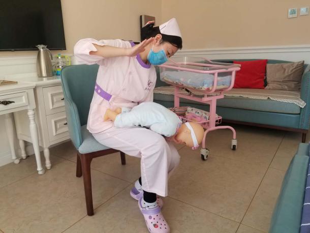 操作方法:立即將患兒取頭低腳高位,俯臥在施救者腿上,讓嬰兒上身前傾45~60度,施救者左手虎口打開、托住嬰兒下頜、打開氣道,用右手掌跟大魚際部位用力扣拍嬰兒背部4—5次,具體位置為背部肩胛骨中間,通過(guò)振動(dòng)使吸入呼吸道的奶汁或痰液排出。